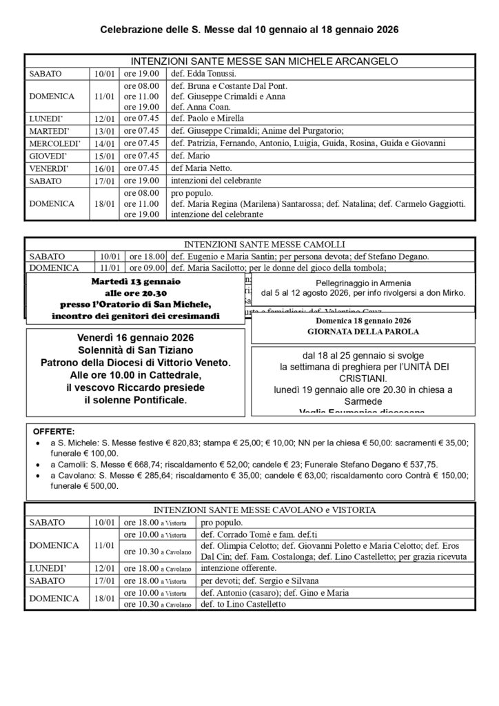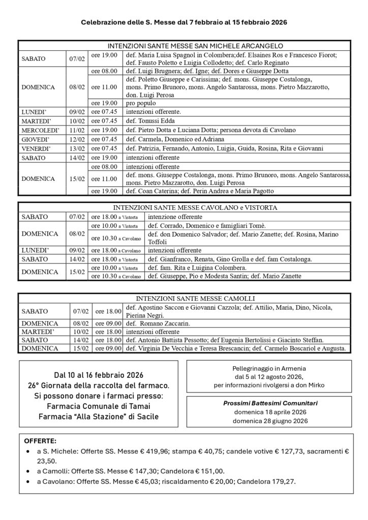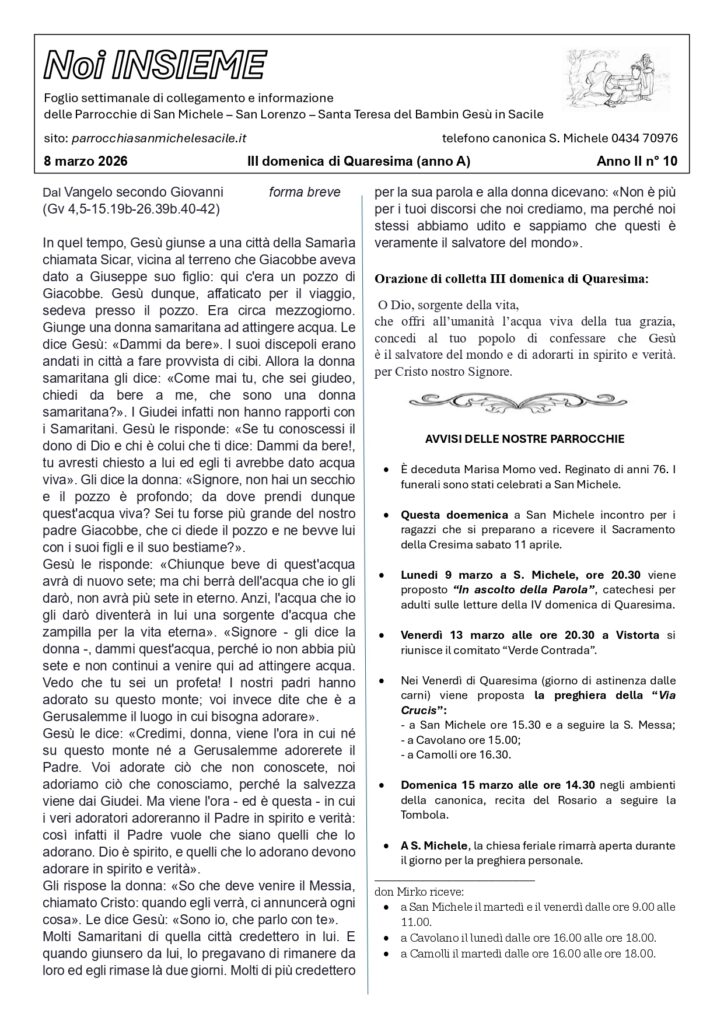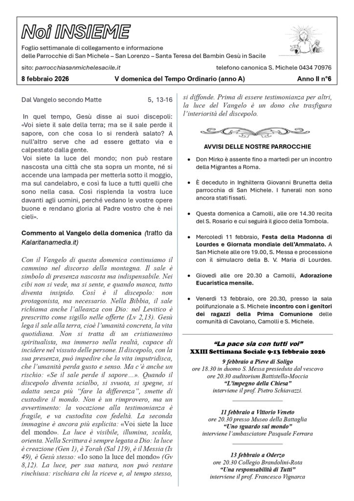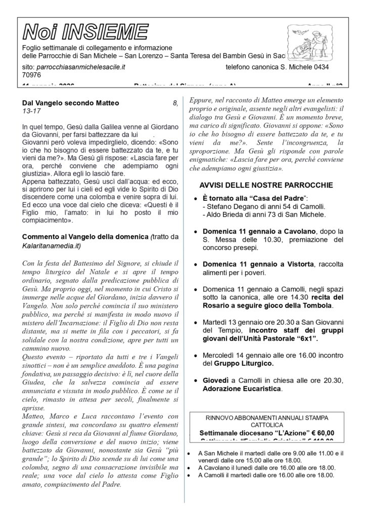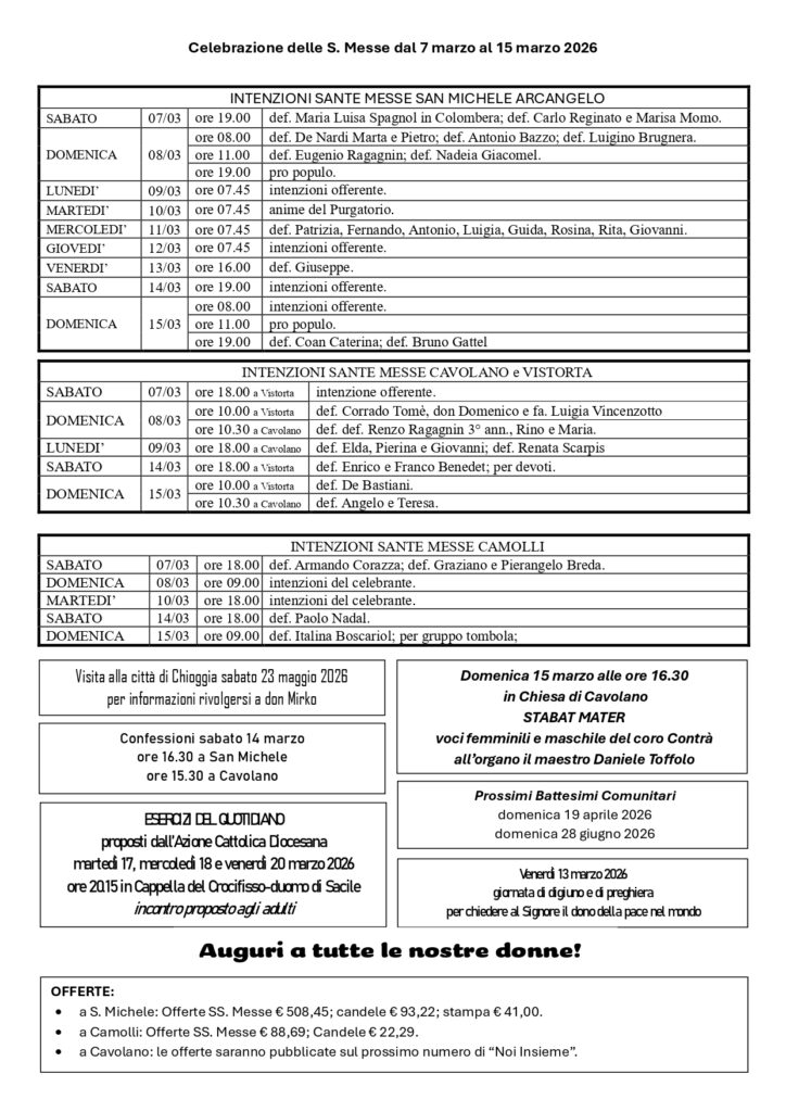 Per gli orari delle messe seguire quanto riportato sul foglietto INSIEME